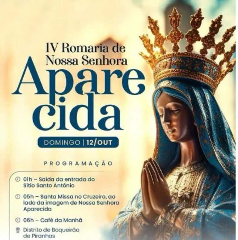 Será realizada neste domingo, 12 de outubro, a IV Romaria de Nossa Senhora Aparecida no distrito de Boqueirão de Piranhas, em Cajazeiras. O evento religioso reúne fé, esperança e perseverança dos fiéis que caminham quase 14 quilometros levando consigo uma devoção à santa, quer em cumprir uma promessa por ter alcançado uma graça ou mesmo uma forma de pedir as suas bençãos.