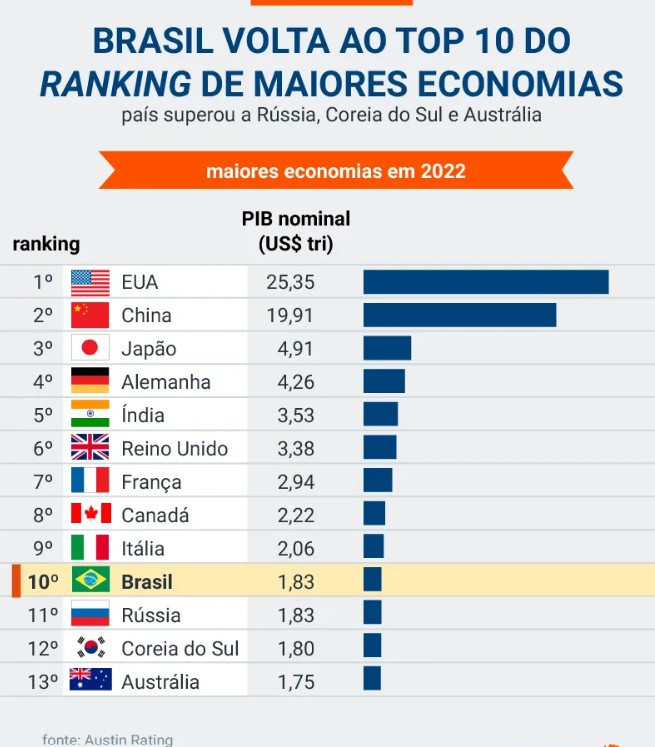 As projeções indicam ainda que o Brasil deve continuar avançando no ranking das maiores economias. Em 2027, a expectativa é que o país ultrapasse a Rússia e alcance a nona posição global. No ano seguinte, poderá superar a Itália e ocupar o oitavo lugar, mantendo-se nessa faixa até o fim da década.